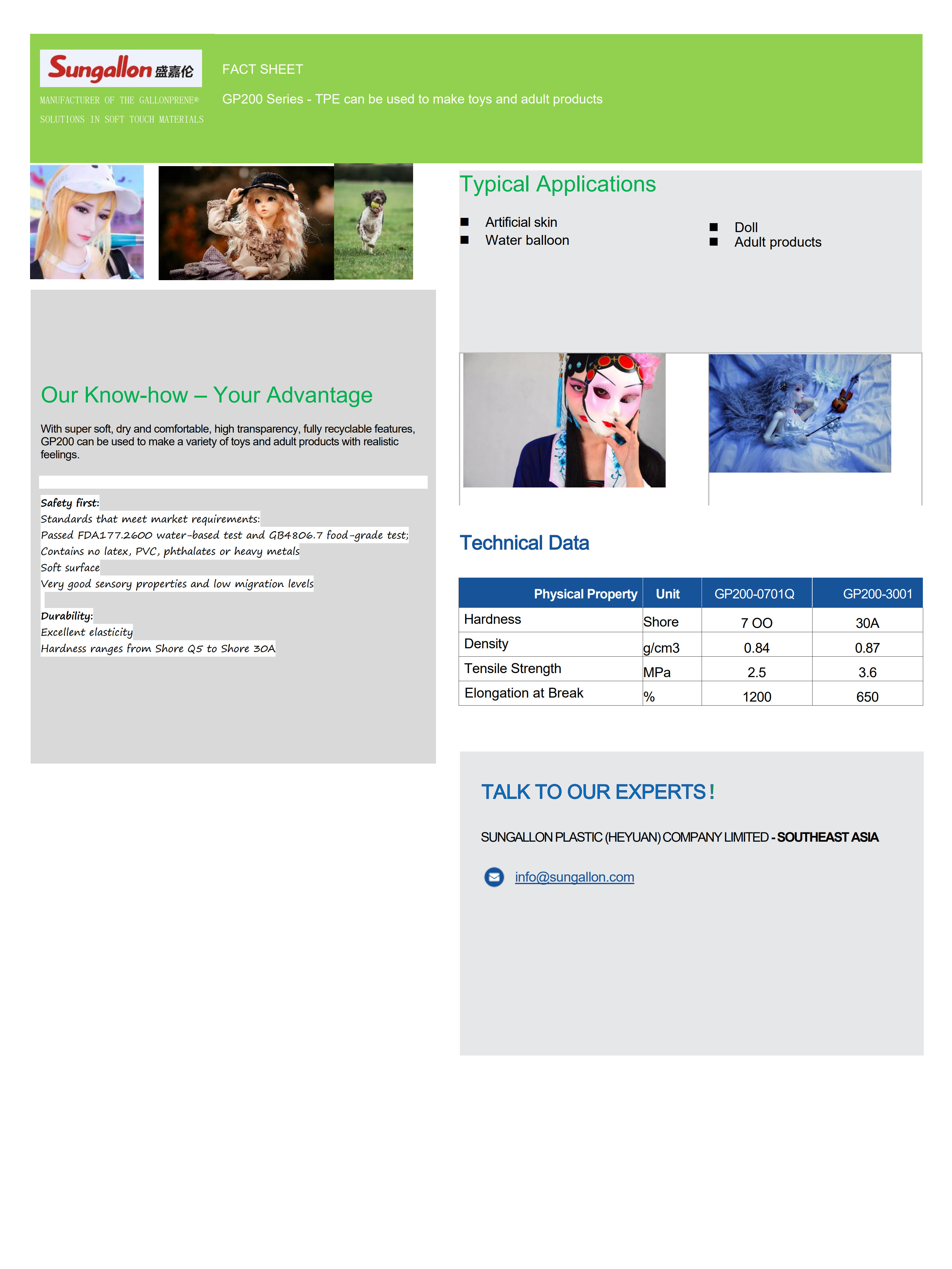 The materials comply with global toy safety standards and has a wide range of hardness, from gel to 30A, and density from 0.84 to 0.87