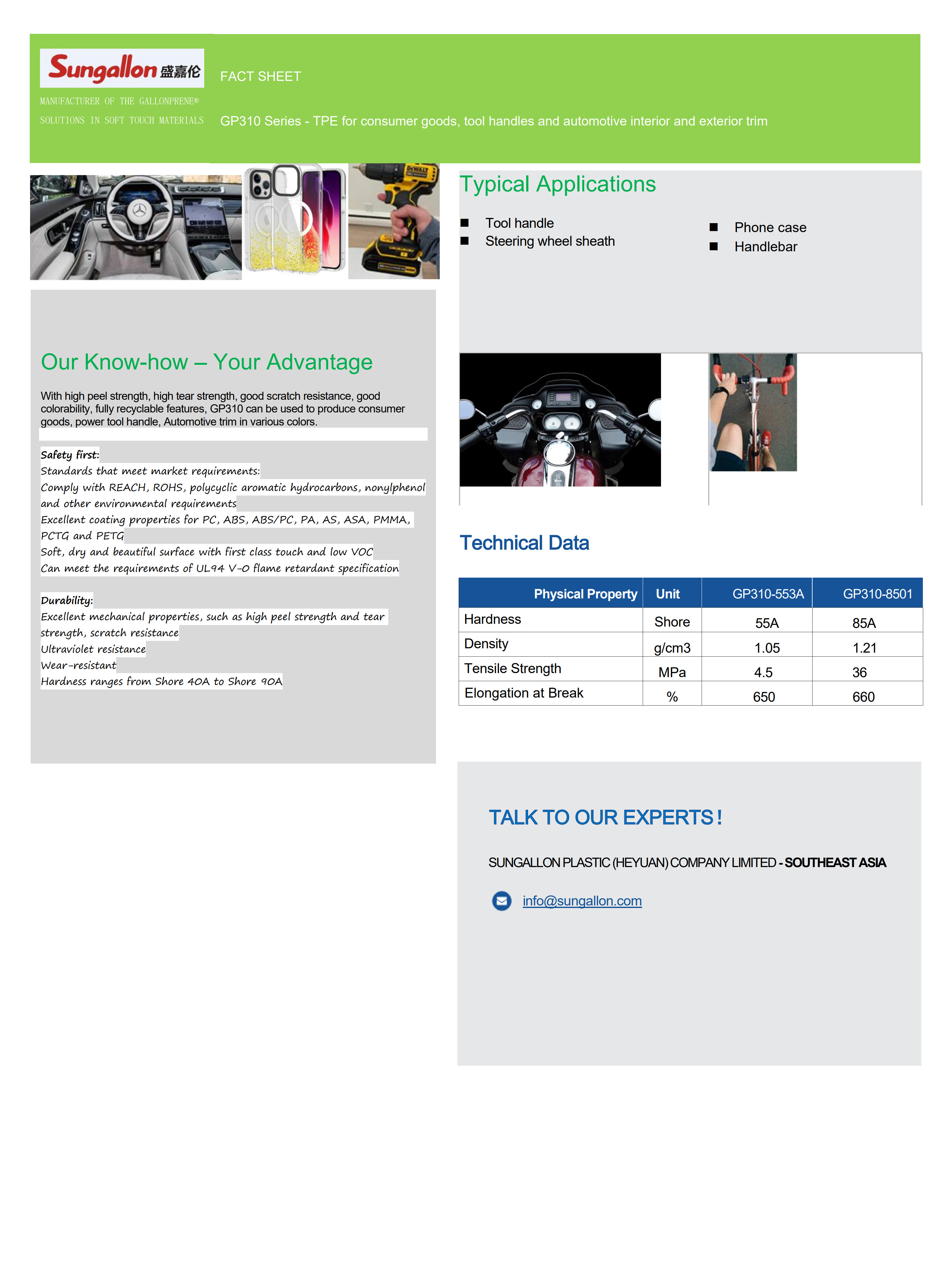 | GP310-8501 | 85A | 36 | 660 | 1.21 | 10(200℃ /2.16kg) |