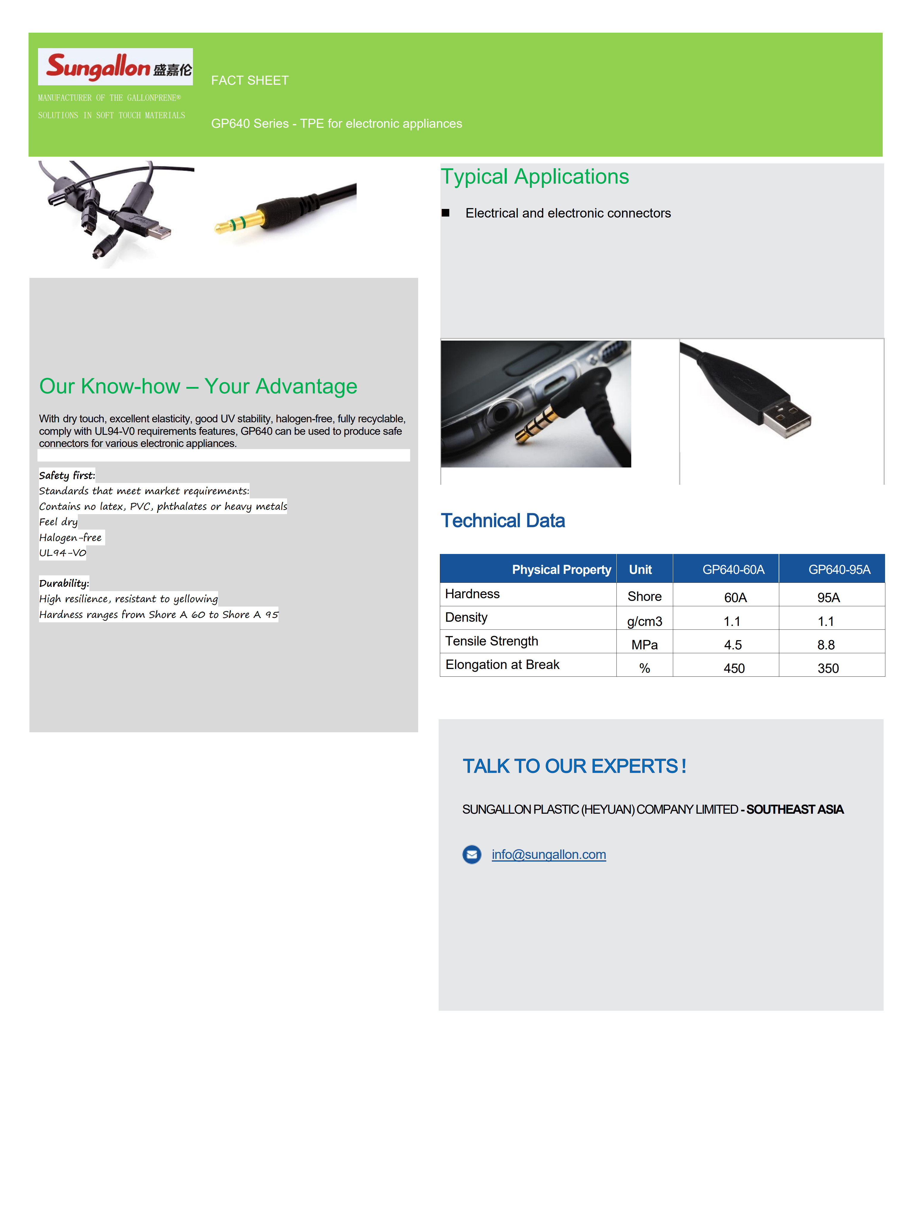| GP640-9501 | 95A | 8.8 | 350 | 1.10 | 14(200℃ /5kg) |